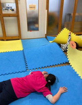 フロアマットの下に潜り込み、鬼役の先生から見つからないように移動します⭐